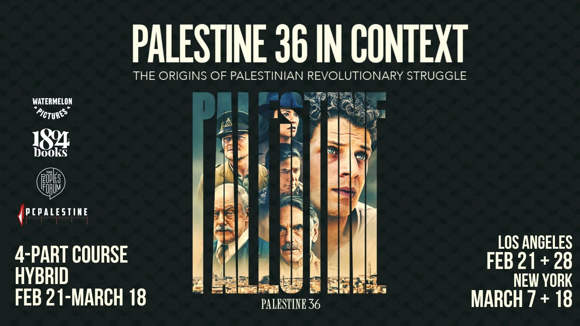 This four-part course explores the roots of Palestinian revolutionary struggle. We will focus on the significance of the 1936–39 Palestinian Revolution, a key moment in Palestinian resistance, brought to new audiences through Annemarie Jacir’s film. Over four sessions, we will engage with how this history has been remembered, retold, and reclaimed over generations—and what it demands of those of us committed to liberation today.