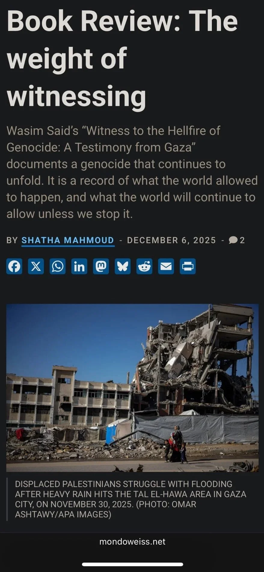 Rooted in a profound love for Gaza and its people, Wasim’s writing captures the collective spirit, generosity, resistance and dignity of the Palestinian people living through unimaginable conditions. His work stands within a long Palestinian tradition of testimony — a refusal to let the Palestinian people’s stories, losses, and endurance be erased.